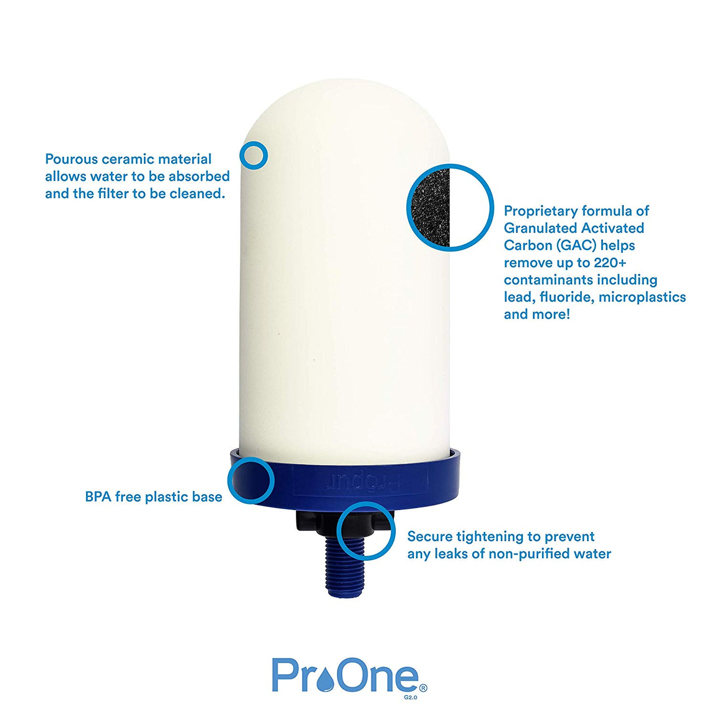 All ProOne® gravity systems feature ProOne® G2.0 all-in-one NSF/ANSI-42 component certified filter technology “ the smarter filterTM. Independent lab tested to NSF standards 42, 53, P231, microplastics,1,4 Dioxane, Microcystin, emerging contaminants, PFOAS (GenX), TTHM™s, bacteria, Fluoride, Lead, Parasites and more. Visit our lab reports for full details on the 200+ tested contaminants.